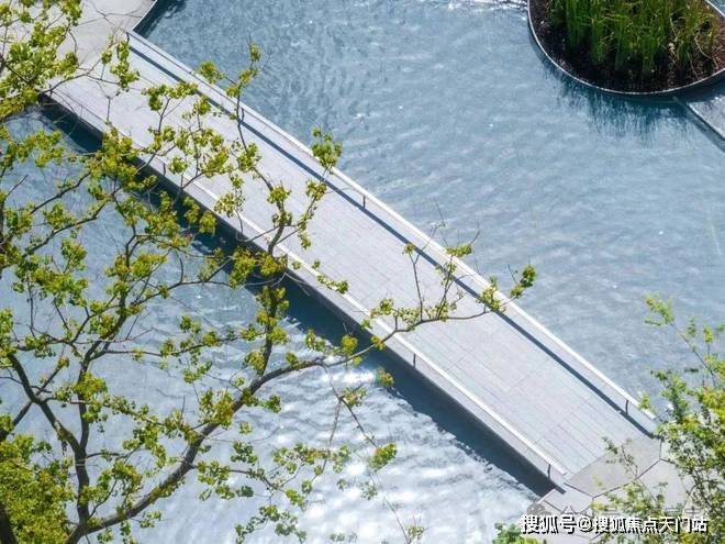 要知道上海已经很少有项目在社区内引入水景了,即使是一些千万级的豪宅,同样如此。而大华星曜不仅打造了具有曲线美感的树池,还在水景底部铺了数百片蓝钻瓷片,全角度弧形定制,水刀切割,用金属线条勾勒出水波的形状。