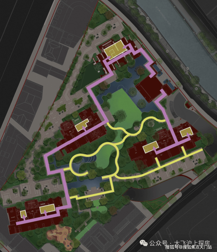 社区约3000㎡的中心花园和6大艺术花园,不仅让每栋楼都享受“楼王”的待遇,且自然勾勒出一条漫游式的公园归家动线(黄色线条走向)