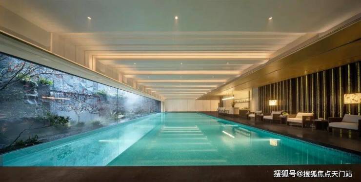 作为 上海首个森林观瀑恒温无边泳池 ,以 古驰黑奢石 与 非遗琉璃 打造背景墙,窗外即是天然岩皮与奢石筑成的三级瀑布,羽毛枫隔窗相映,沉浸式自然观景体验拉满。