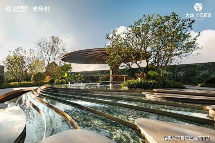 首先,大华公园柏翠利用12级叠水、2座树池、9步水上汀步,运用六重造景的手法打造近500平的中央水景!