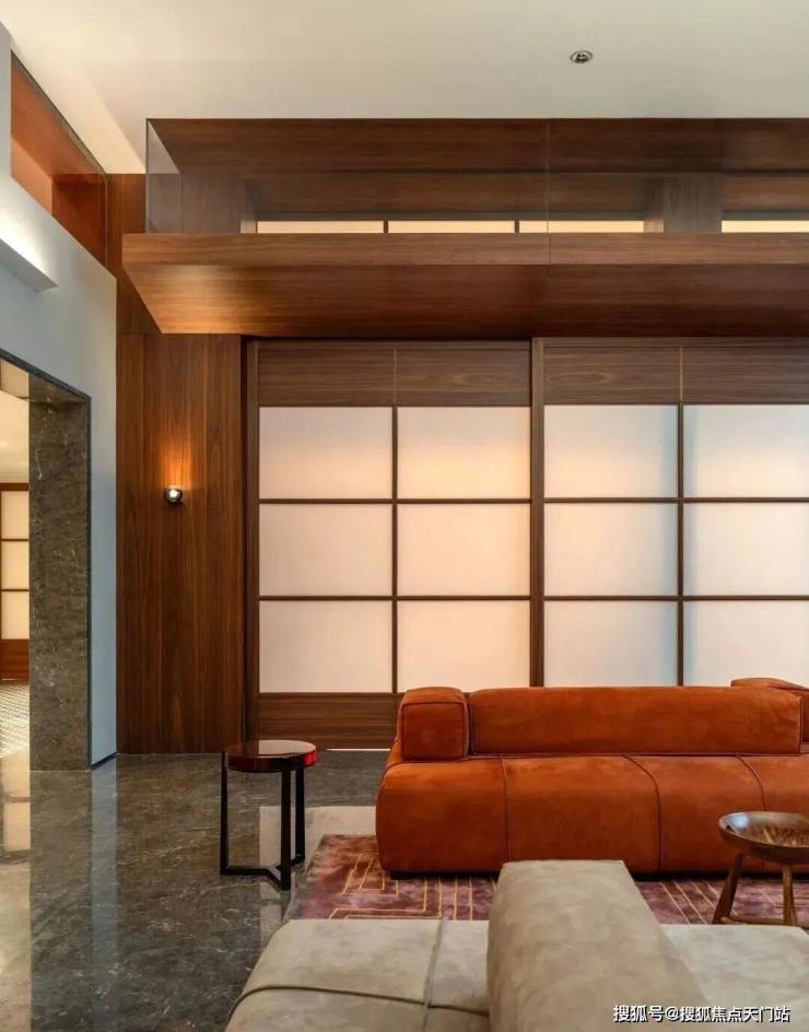 在客厅中,两个展示架巧妙地将空间分隔成主客厅区和休闲室,营造出一个与建筑尺度交相辉映的层次空间。