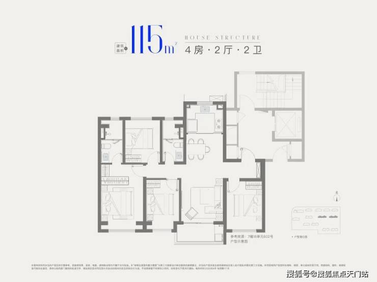 建面约115㎡4房2厅2卫,做到了四开间朝南+全卧室带飘窗+主卧套房设计,一步到位的大四房户型。兼顾大4房的功能性和空间尺度,非常难得,更适合四口之家或三代同堂家庭居住。