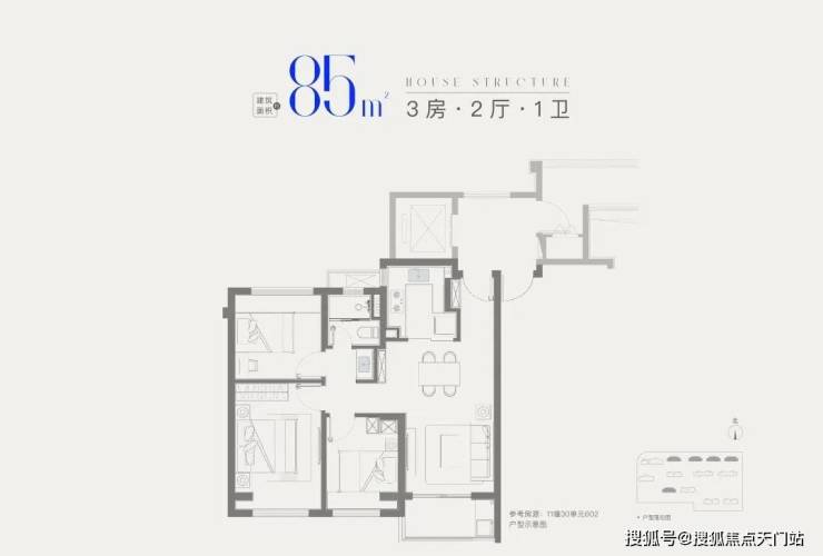 建面约85㎡3房1卫,做到三开间朝南+全卧室带飘窗+卫生间干湿分离+动静分离,非常紧凑的小3房。