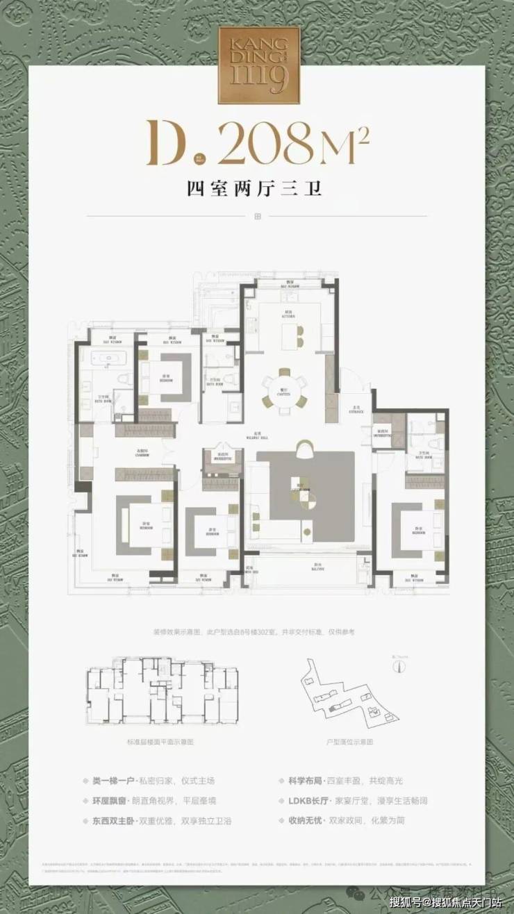 建面约208㎡4房:四开间朝南的边套宽奢4房,约270°的巨幕采光面,让这个户型的每一个空间都充满阳光,终极改善的首选户型。