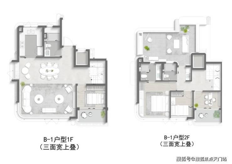 再来说项目的 叠墅产品 :约 9.5 米南向三面宽、 独门独户 、约 6.1 米地下室挑高(下叠)、 超大露台 (上叠),可以说, 将墅居的尺度感和扩展空间拉满!