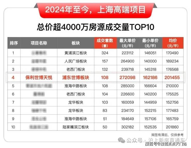 再将时间轴往前移,从2023年至今上海豪宅单价超20万/m²的成交量排行中,保利世博天悦甚至力压新天地、外滩、陆家嘴、苏河湾、徐汇滨江等一众热门板块新盘,问鼎上海豪宅之巅!