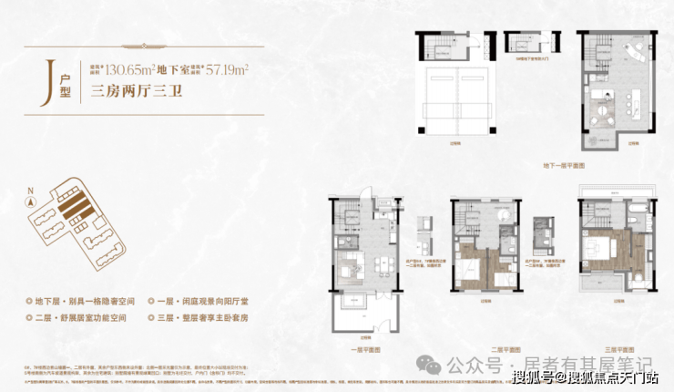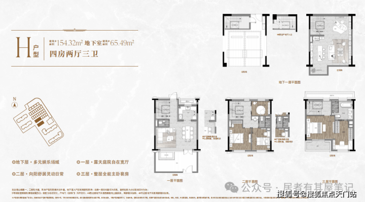 一楼和地下室主社交和志趣,二楼是子女的房间,三楼是主人休憩区。