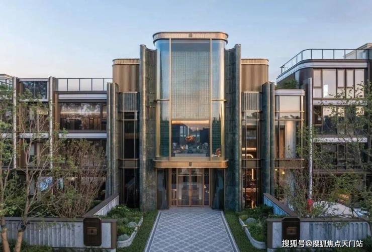萃屿原墅立面采用 大面积玻璃、金属线条、威斯康白石材 , 将松江新城的住宅建筑美学拉入下一个LEVE,尤其是 香槟色金属线条 如剪裁合体的高级西装骨架,勾勒出建筑的精致轮廓。特别值得强调的是: