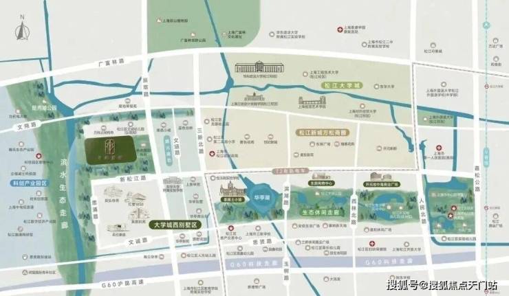 萃屿原墅所在的松江新城高端别墅区北接 松江大学城 ,南临 G60科创走廊 , 东靠 政务金融中心 , 西邻 油墩河谷规划 ,兼具成熟配套与产业动能: · G60科创走廊 : 长三角一体化重要引擎,连接沪苏浙皖3省1市9个重要节点城市,松江段形成约 2700 家企业集群,其中高新科技企业约 324 家, 产业势能与人口红利非常强劲!
