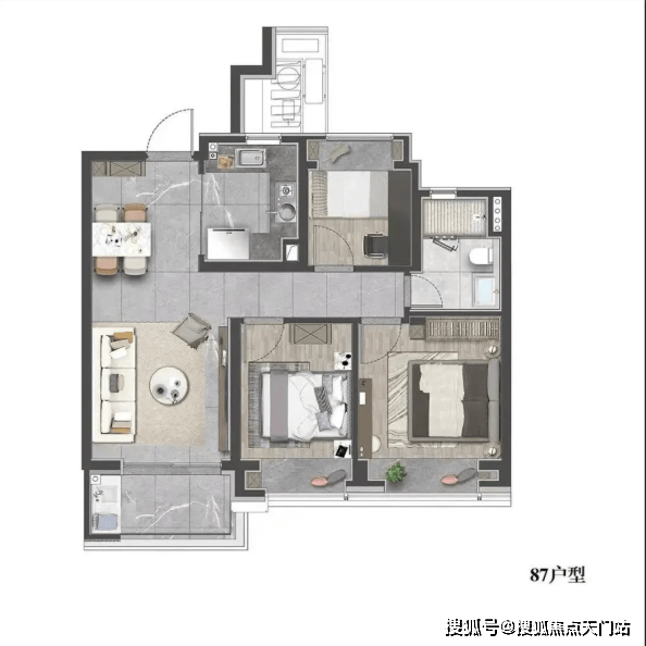 建面约87㎡3房,做到了三开间朝南设计,整个户型几乎没有浪费面积。实现空间节约、居住升级等美好体验。