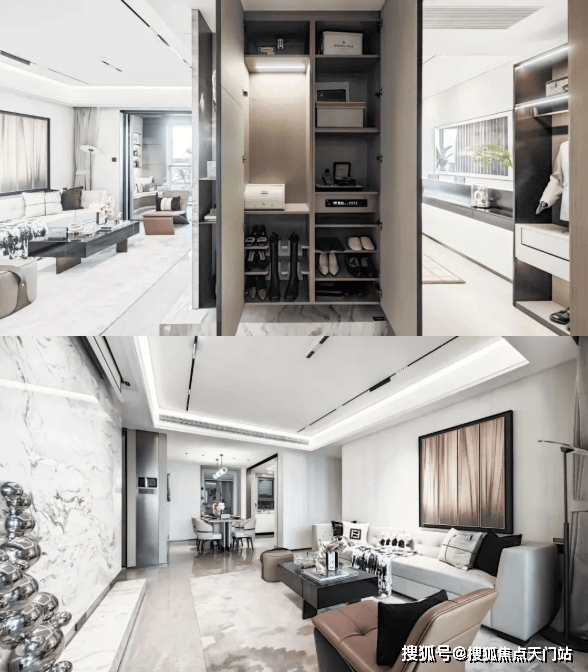 整体效果现代精致,十分符合当下年轻人的审美观;星级酒店式入户门,挑高约7米,宽约60米;石材金属线条背景墙加暖色系夜灯搭配,中庭花园水岛层叠、景墙错落,槭树青红间季节流转的温情脉脉展现,精致的水景让居住者仿若初入剧宴,感受剧目的艺术呈现……