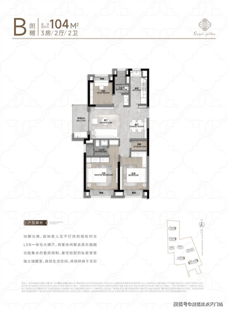 104㎡3户型特点:该户型多为楼栋的 东边套,是一个观景户型。客厅连接270°阳台,视野出众。双卧朝南,阳光满溢。从次卫布局看,如果家庭人口较少,该户型还能做成双套卧。