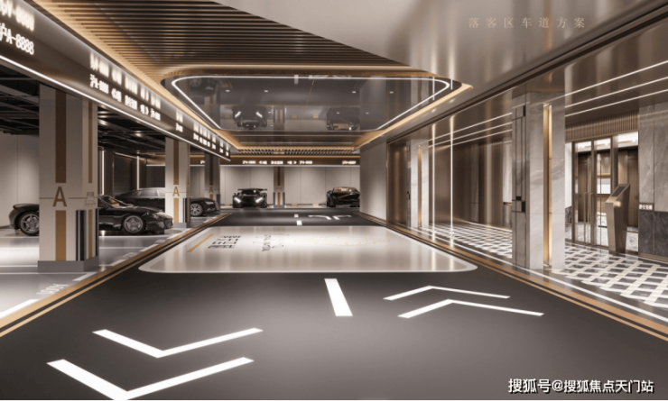 项目车库采用贯穿式鱼尾灯坡道和超耐磨地坪,过道全部采用精装吊顶,地下管道和局部区域进行二次包裹!尤其惊艳的是项目的豪华车马厅, 采用水磨石、水晶漆、铝饰面、大板砖、立柱石材包边、门禁系统三合一!