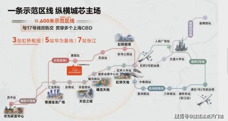 示范区沿线汇聚大量高能商业。2到到前湾芳乐路TOD,有开市客及前湾印象城(在建),3站到虹桥枢纽,则有虹桥天地及龙湖天街等。另外徐盈路天空之城、徐泾蟠龙天地、百老汇等也能快速抵达。