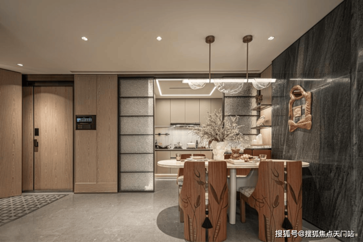 墙面,严选 安第斯雪或晓山青 珍贵石材,与木饰面、特色定制墙布组合设计;客厅、餐厅、卫生间等区域地面定制石材,赤足走过,温润细腻的触感。