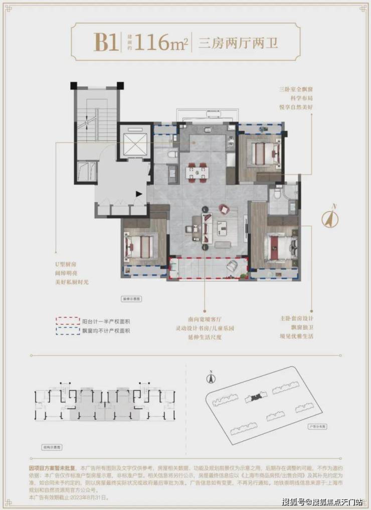 116m²户型特点:三卧室全飘窗,科学布局,悦享自然美好,南向宽境客厅,灵动设计书房/儿童乐园,延伸生活尺度,U型厨房,阔绰明亮,美好私厨时光,主卧套房设计,飘窗独卫,境见优雅生活。
