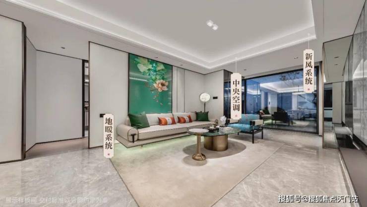 客厅连接观景阳台、餐厅,通透明亮,配置日立/东芝中央空调(或同档次品牌),AO史密斯/阿里斯顿地暖(或同档次品牌),及美的/格兰斯柯新风系统(或同档次品牌),多维度多空间多场景气温自调节,以360度温润呵护,打造一个充满新鲜空气的健康环境,让家中每一处空间气温都舒适随心。