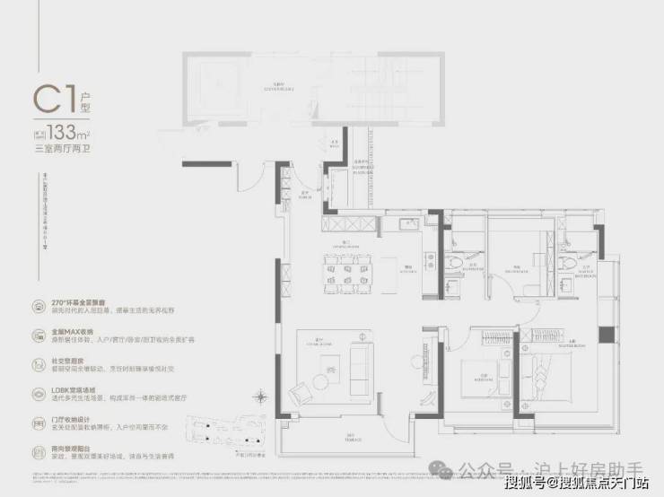 133㎡可以说是108㎡的进阶款,同样的三房两厅两卫,大面宽横厅、半开放式厨房设置岛台,加上主卧L型飘窗,再一次验证了华润置地豪宅化的产品思路。