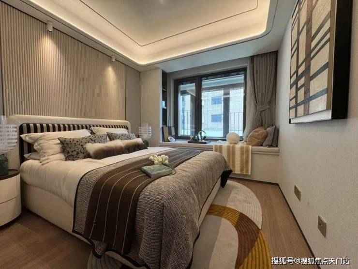 北房间借助飘窗可作为完整卧室使用,吊顶比较有特色,做成了海浪状的。