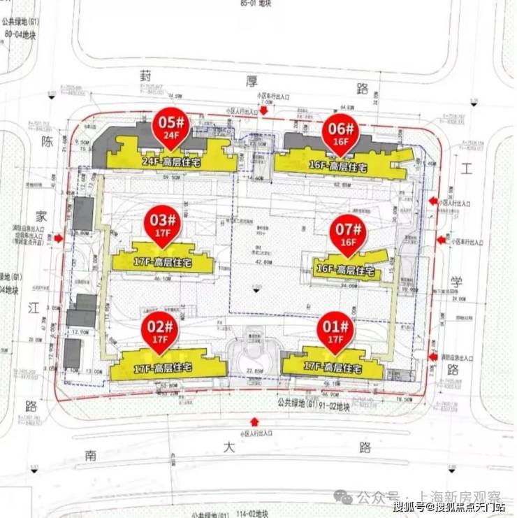92-01地块拟建6栋15-17F高层住宅产品,并且全部做了首层架空。值得一提的是,项目小区出入口做了景观架构, 在3号楼与5号楼之间做了下沉庭院,并在小区中央配置了1623.59㎡的集中绿地。