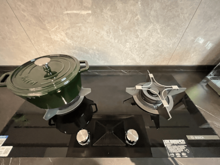 厨房灶台并不像很多项目做了“三眼灶”、“四眼灶”,其实灶眼多反而放不下中式的大炒锅;缦云上海选用的这款BOSCH博世炉灶,液晶面板可定时,这样煲汤的时候就无需盯着;钢化玻璃材质,更易清理,油渍不容易渗入。