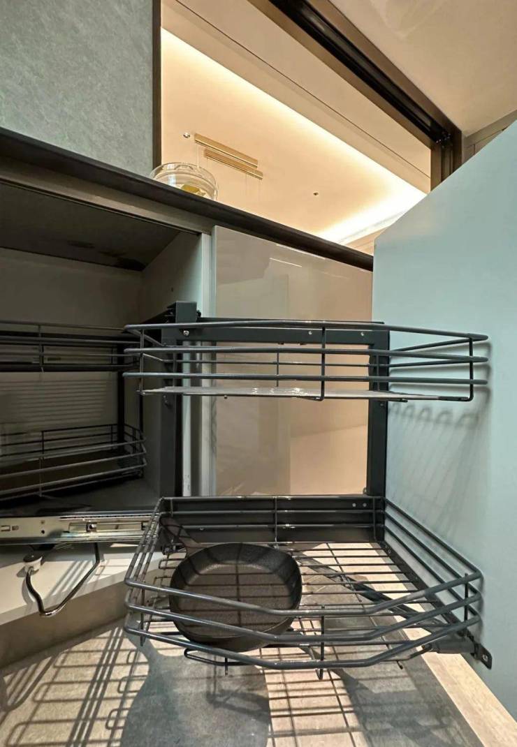 下方的橱柜则做了转角拉篮,充分利用转角空间,使物品井然有序的同时,轻松方便取放。
