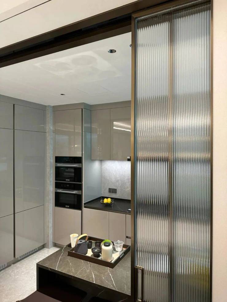 厨房玻璃门是上轨道移门,意味着地面部分没有任何轨道,不会有灰尘积攒,炒菜时关上,避免油烟散入室内;平时拉开,可以扩充室内视觉感受。