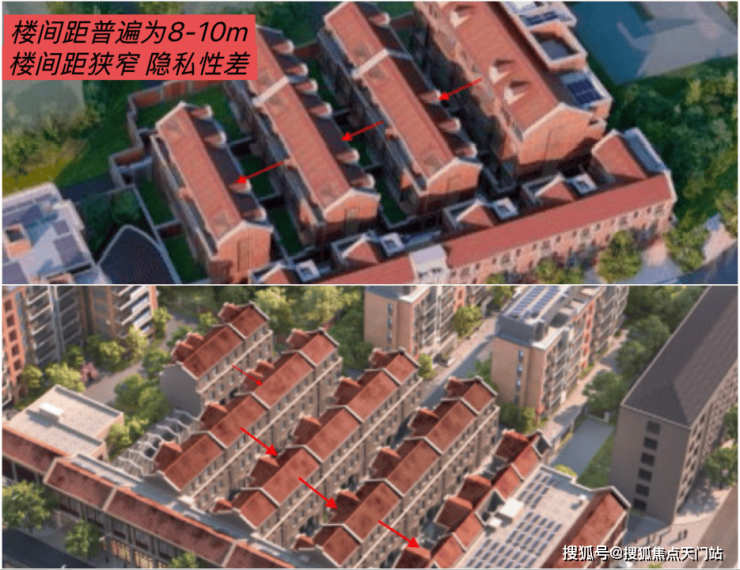 很多市中心低密的风貌别墅,哪怕容积率也在1.2左右,但它们的楼间距并不可观。几乎是在8-10m,宽一点的约12m,楼与楼之间非常紧凑,私密性难以得到保障。