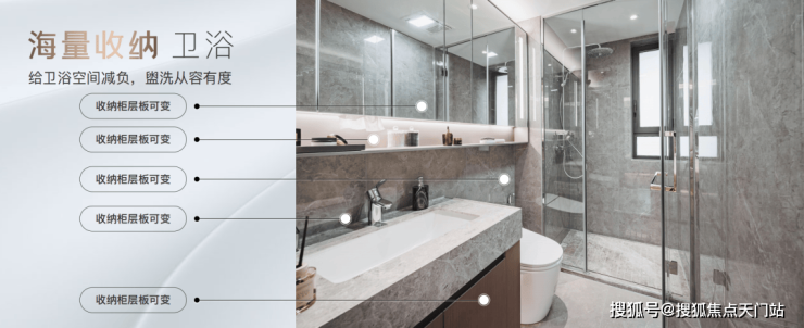卫浴收纳系统:可抽拉龙头、收纳柜层板可变式设计、金属拉篮式设计、预置吹风机器、270°镜、防雾镜、美颜灯等;