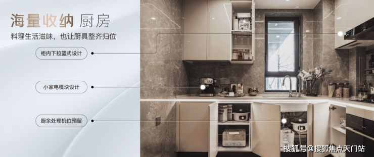 橱柜收纳系统:特别预置洗碗机、柜内下拉篮式设计、不锈钢挡油板、柜下操作灯、烹饪全流程功能动线一体化设计;