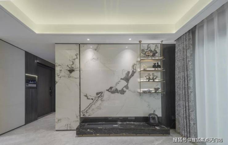金茂定制壁布/墙纸:结合芬迪白岩板打造的客厅背景墙,营造独特的归家氛围。