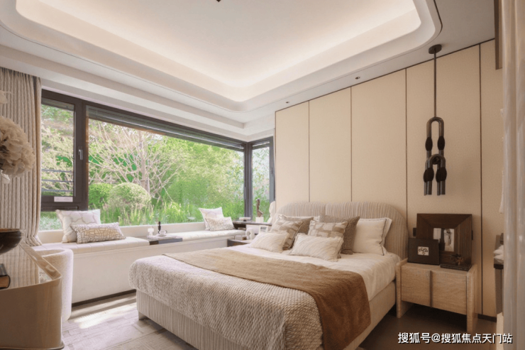 主卧270°转角飘窗 ,是“情绪自留地”:垫个软垫成阅读角,甚至能打造成迷你储物间,换季衣物收得整整齐齐。