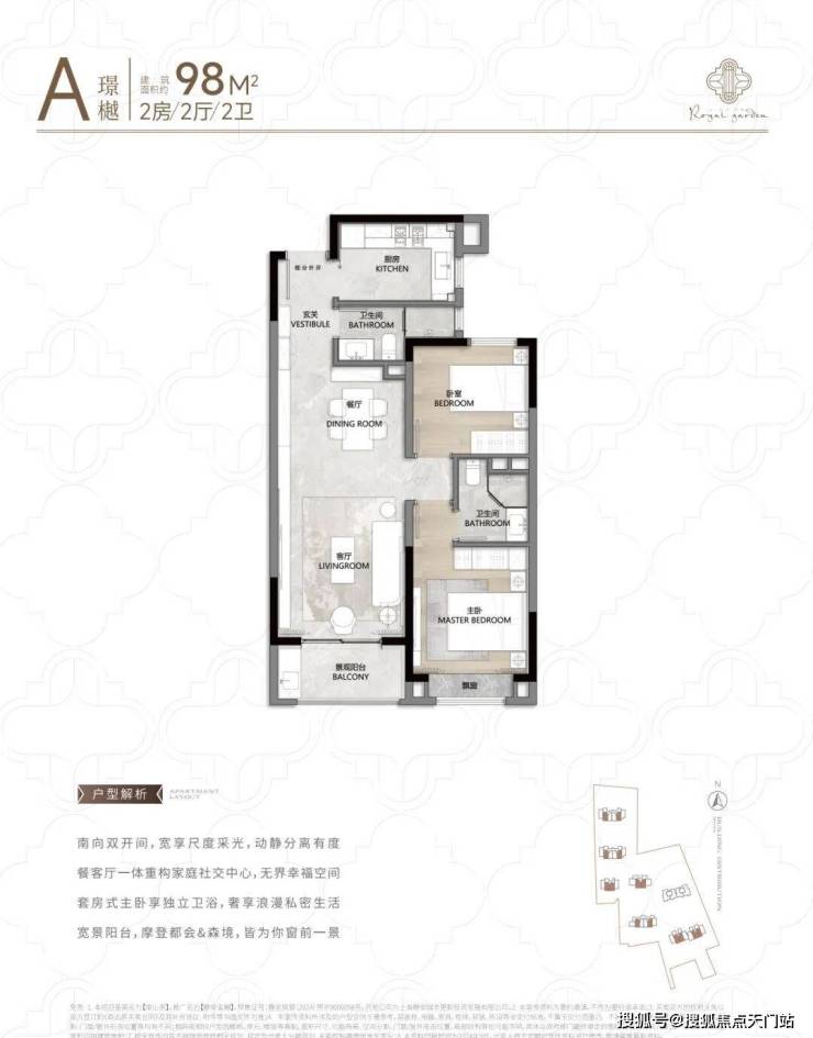 该户型多为楼栋的边套,是一个观景户型。客厅连接270°阳台,视野出众。双卧朝南,阳光满溢。从次卫布局看,如果家庭人口较少,该户型还能做成双套卧。