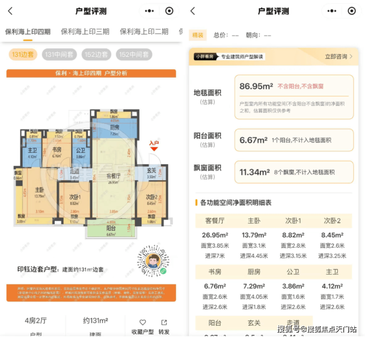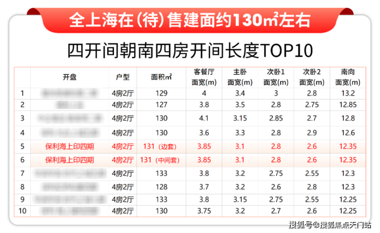 其中保利海上印四期待加推的建面约131㎡四开间朝南4房户型全部上榜,位列第五第六。