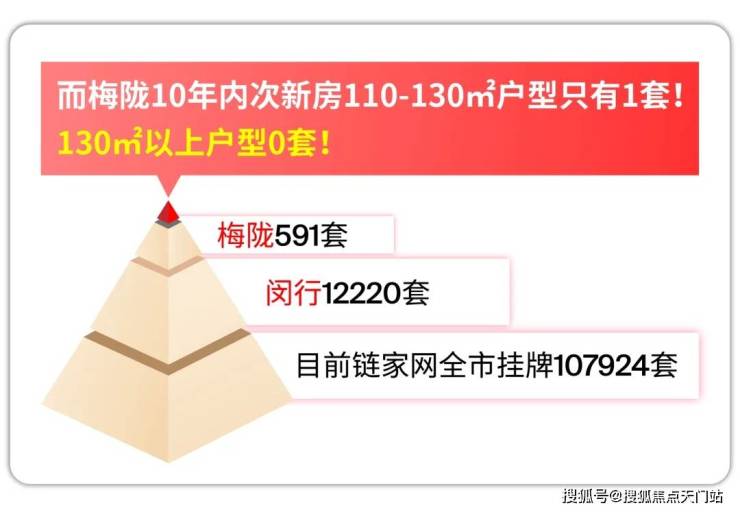 目前链家网全市挂牌107924套,闵行12220套,梅陇591套,而梅陇板块10年内次新房110-130㎡户型的挂牌只有1套!130㎡以上户型更是零封,1套都没有!