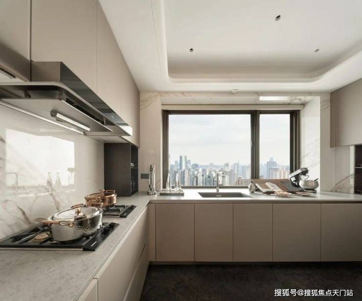 厨房内竹纹夹丝玻璃门、威乃达坡璃烤漆橱柜、与卡拉拉金大岩板台面相融,同时嘉格纳十件套满足每一种味蕾的偏好,厨房内,灶台/油烟机/洗机/冰箱(独立分体设计)五件套;向外,嘉格纳咖啡机/暖碟机/酒柜/烤箱/蒸箱等西厨五件套配置,构筑中西共融的烹饪场域。
