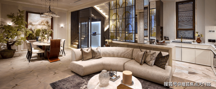 整层会客空间: 动静上下分层,1-3 层贯通梯与电梯井(预留)设计,最大化减少空间浪费。首层大横厅设计,拥有宴会级客厅与开放式餐区,奢阔的待客排场。约8.7米南向面宽,搭配大面积落地窗,无缝链接私家庭院。预留大面宽耳房可改造为独立套间,满足多样化需求。