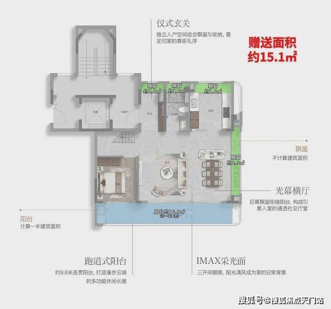 约9.8米跑道式阳台 :三个南向阳台贯通连接,形成上海罕见的“跑道式”超大阳台,将室内生活场景无限向外延伸,无论是晨起健身、午后茶歇,还是夜晚观星,皆有风景相伴。