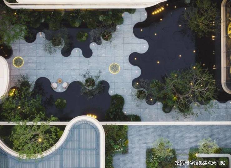 气泡花园:以 “气泡” 为灵感,取莫奈画作色系,将气泡绽裂瞬间定格于水院。以库班绿奢石为地面基底,水纹肌理搭配精工裁切,高端材质与艺术设计,臻贵奢享。