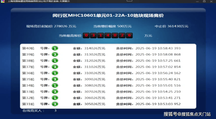 6月19日,闵行1幅地块出让,地块名称为颛桥镇MHC10601单元01-22A-10地块,规划用地性质为住宅用地,出让面积4.05公顷,容积率为2。经过40轮竞拍,最终由上海保利城市发展有限公司竞得,总成交价314026万元,溢价率12.95%。
