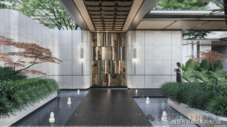 在门庭外,辅以两侧具有仪式感的跳泉水景,将建筑的圆弧美感与自然水景相合,共同构成海上·清和玺“贵雅清和”的城市界面。