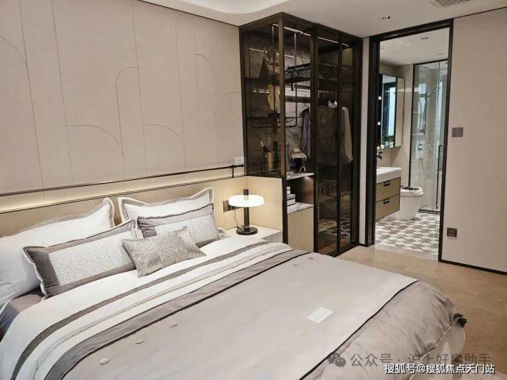 主卧套房设计,皮革造型的床背景墙也是交付标准,台盆为唯宝(或同等档次)、龙头则为科勒(或同等档次)复古龙头,马桶为高仪智能马桶(或同等档次)。