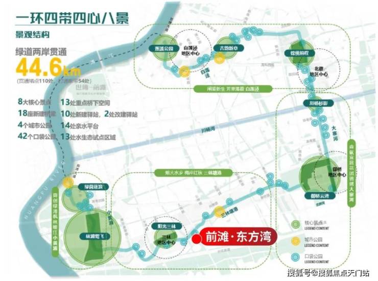 周边 前滩友城公园、前滩体育公园、东明公园 等已建成公园, 三林塘港、“林浦莺飞”、“绿茵逐浪” 等核心景点将连缀成片,形成气势磅礴的滨水公园带。