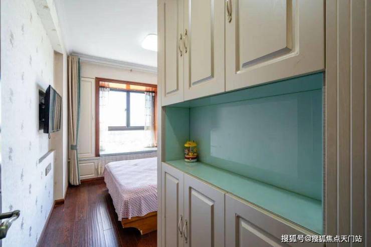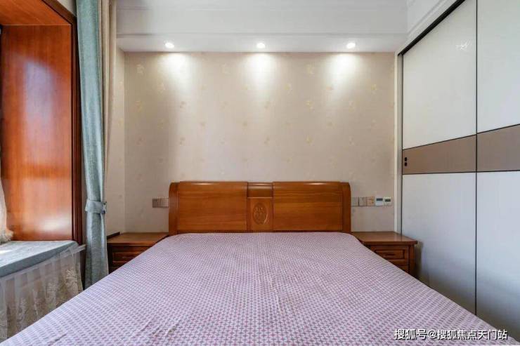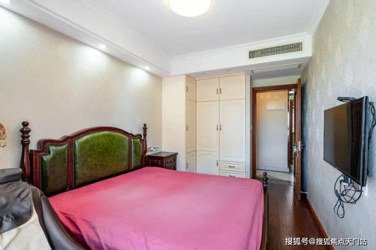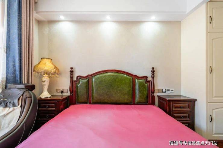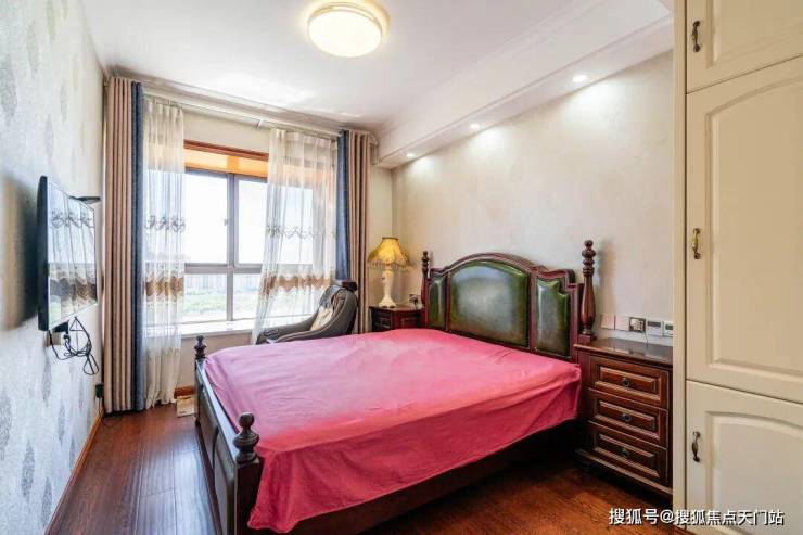 卧室复古床具精致,暖光洒落。窗边躺椅静候,傍晚窝在那儿,看墙上电视,晚风从纱窗溜进,惬意漫上心头。