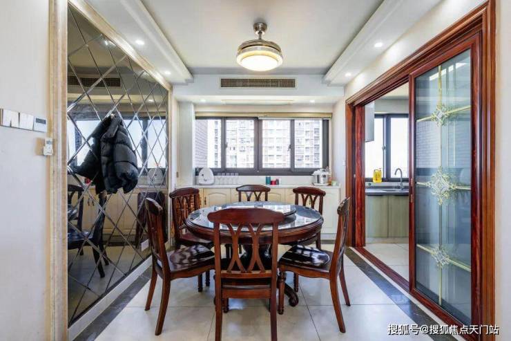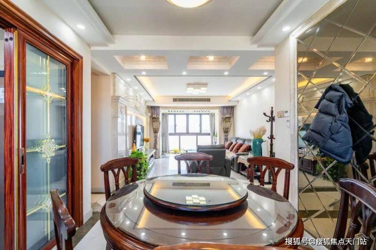 餐厅与客厅衔接自然,镜面墙、精致顶灯点亮空间。周末,家人围坐圆桌吃饭,客厅沙发上的笑语也能传来,温馨满溢。