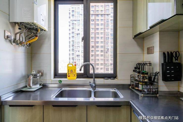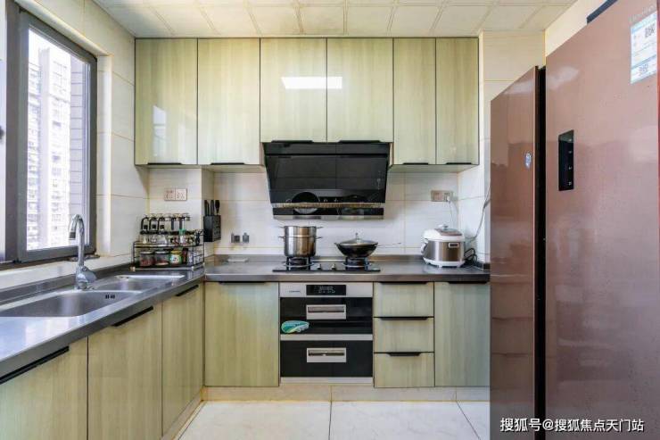 厨房浅绿橱柜清新,采光佳。锅铲碰撞,食材在锅中翻滚,油烟被强劲烟机吸走,烹饪时满是创造美味的愉悦。