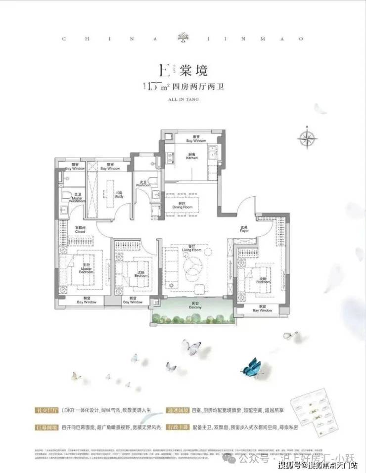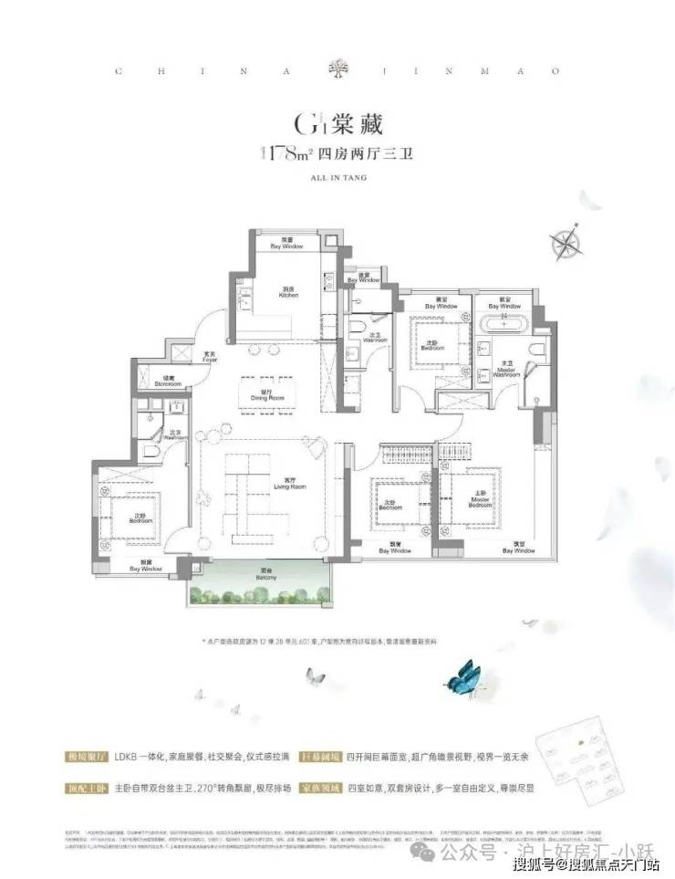 建面约117㎡3房2厅2卫,做到了3+1开间朝南+5个飘窗+主卧套房设计+270°转角飘窗,所有的尺度都有进一步提升。