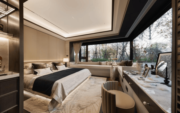 其中主卧的270°转角飘窗就有约5.7m²,通过与外立面的结合,直接做了梳妆台和储物柜,拓展了飘窗的实用性。