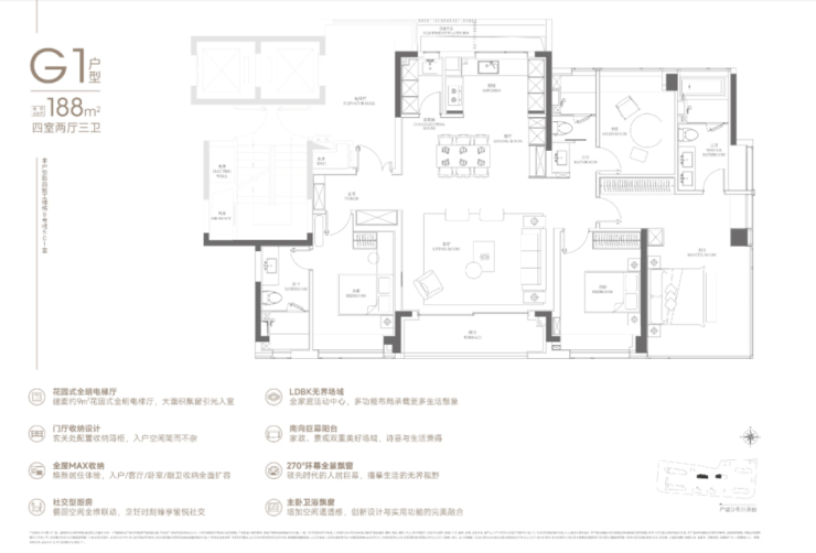 188户型2梯2户,有独立的电梯厅。4房3卫设计,还是3明卫,这两点还是不错的。