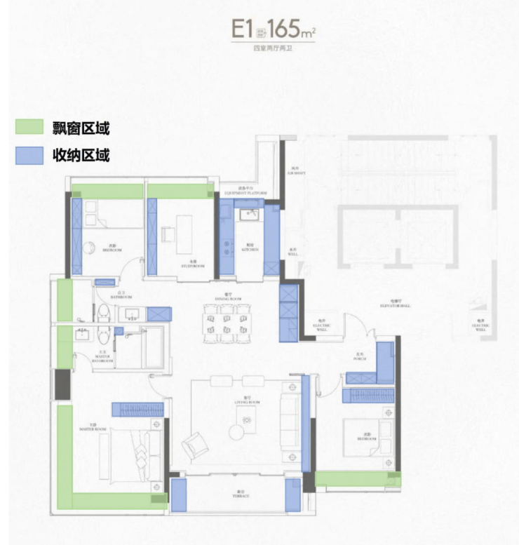 下图蓝色为收纳区域,绿色部分即飘窗区域: